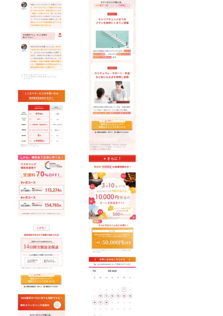ランディングページ制作 2025年8月17日 最終更新日時 : 2025年8月17日 doraemon-ikumi 【製作時間】20時間【使用ソフト】Photoshop・illustrator・Figma・HTML・CSS・jquery【担当業務】デザイン・実装【意識した亊】スクロール離脱を防ぐためjqueryで動きをつけたLPを作成しました。